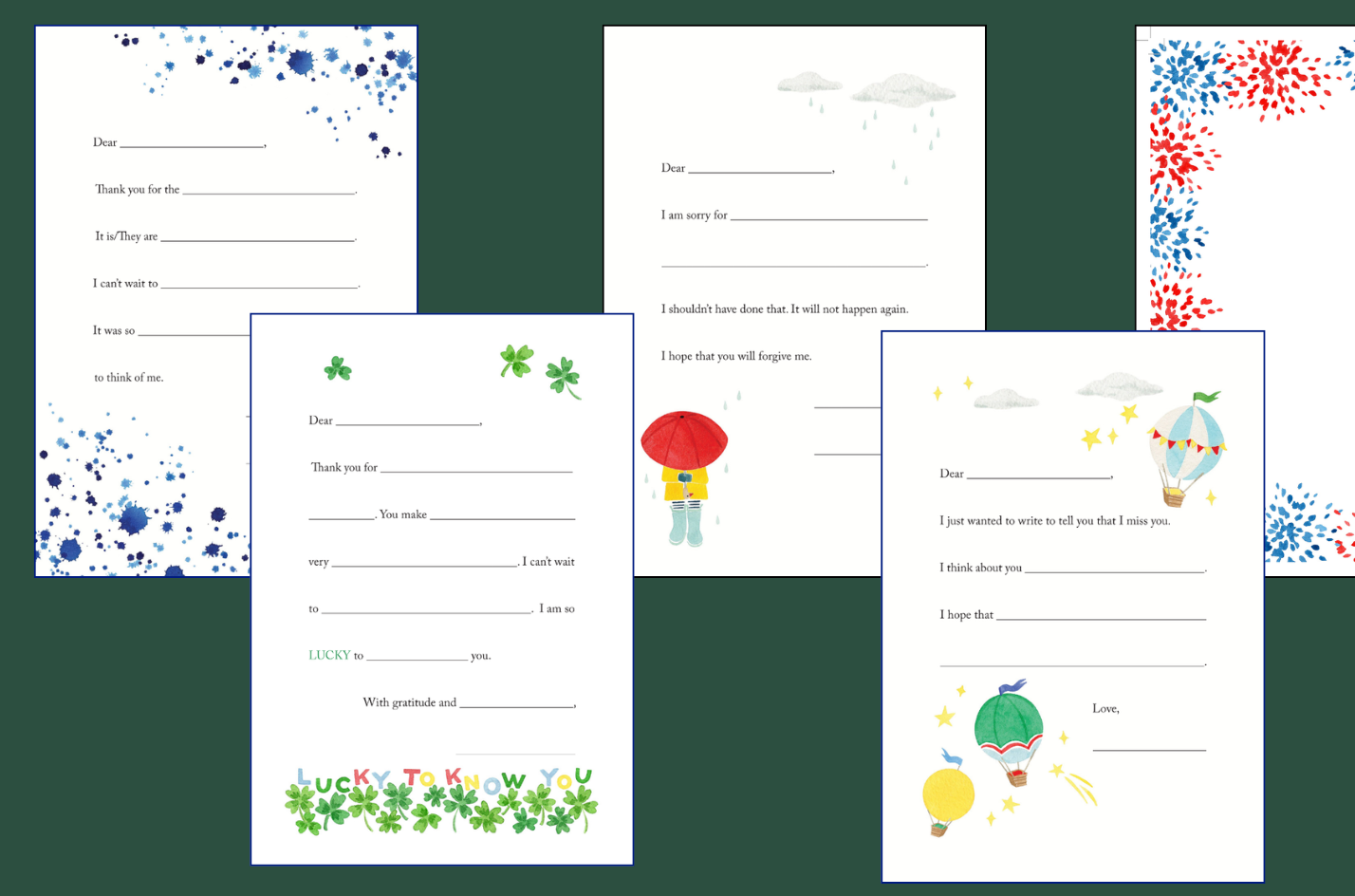 (2) Thank You (2) I Miss You (2) I’m Sorry (2) Lucky to Know You (2) Blank sheets with Fireworks border (for additional thoughts or drawings).